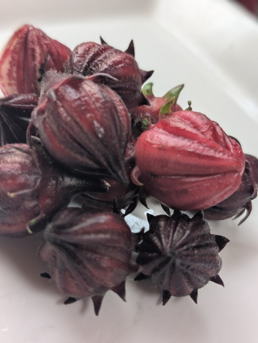 秋から初冬にかけて深く色づくローゼル(ハイビスカス)の萼(がく)。<br>